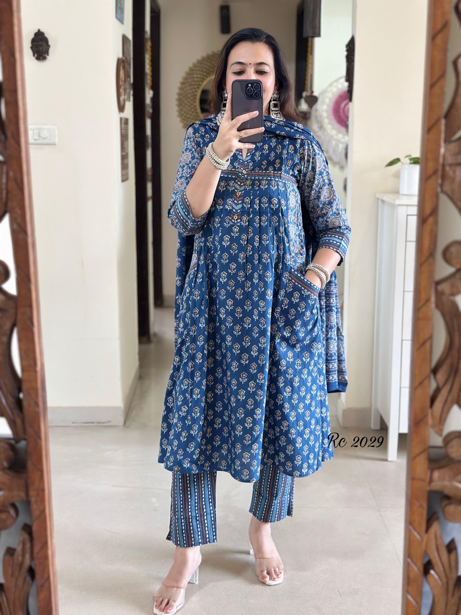 Teal Green Kalamkari Designer Suit with Fusion Azrak Print Kurti Pant Dupatta Set