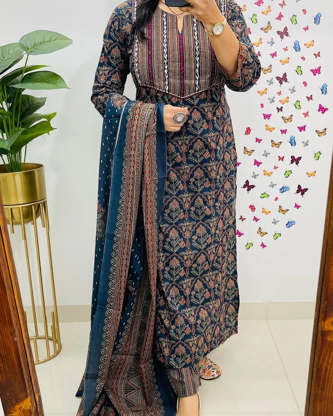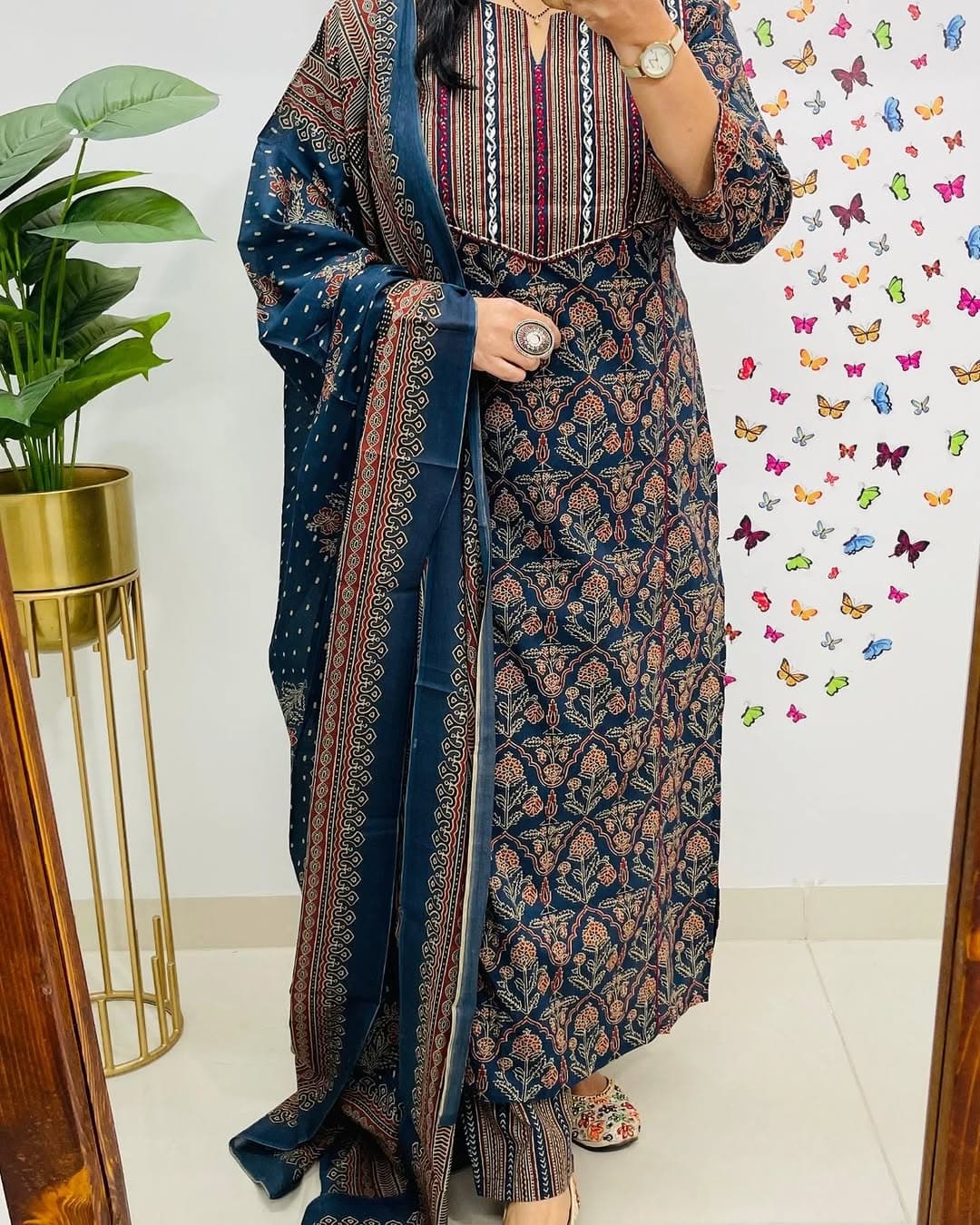 Women Cotton Blend Kurta Palazzo Dupatta Set